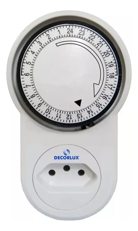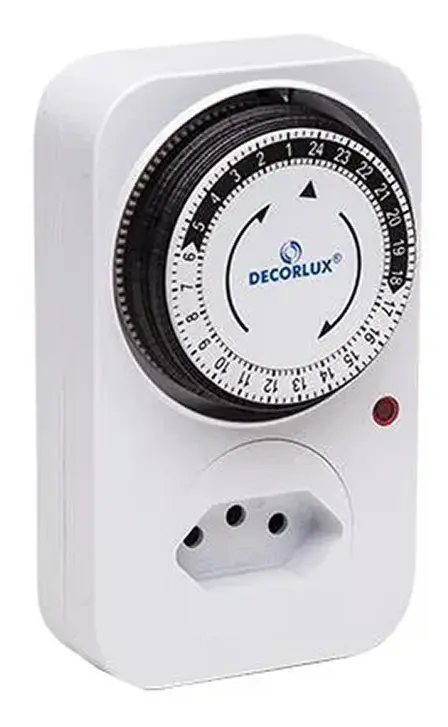 O temporizador analógico da Decorlux é um dispositivo usado para ligar e desligar automaticamente aparelhos elétricos em horários programados. Ele funciona através de um disco mecânico com pinos ajustáveis.